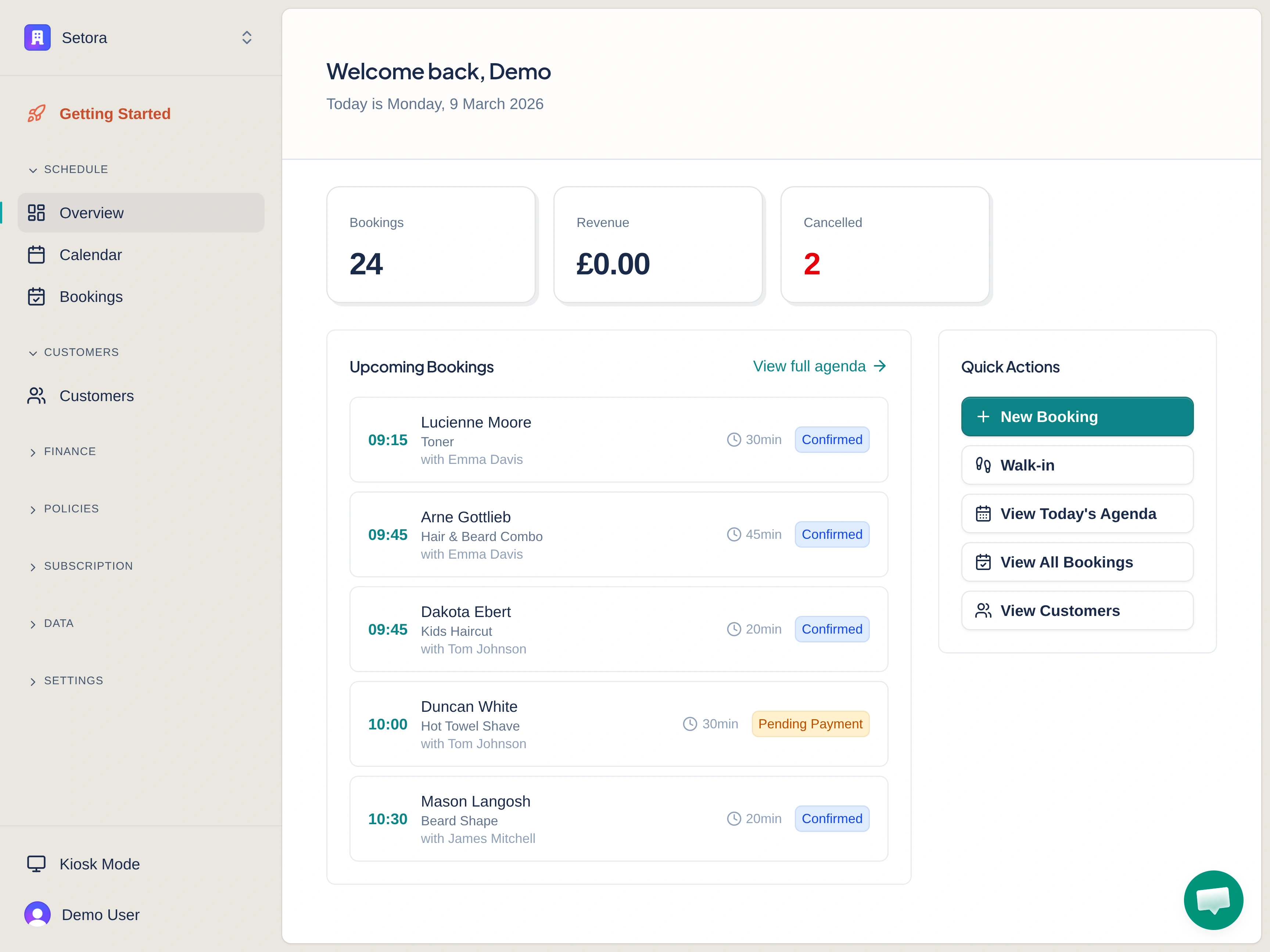 Yes. Setora offers a 14-day free trial with no card required. You get full access to every feature - online booking, kiosk mode, reminders, payments, analytics. If it's not right for you, cancel before the trial ends and you won't be charged.